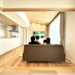 リビングとキッチンがお気に入りです。リビングは開放感を重視して、キッチンの床はフロアタイルを採用して、広いキッチンスペースを確保しました。