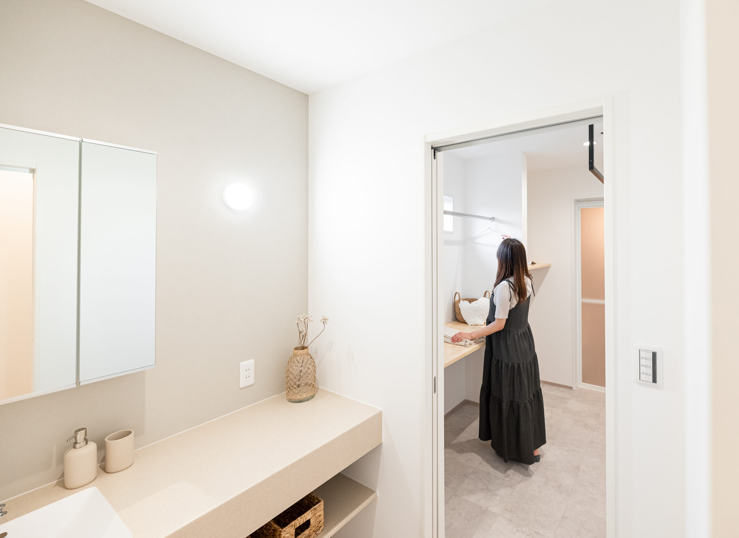 ガレージ、土間、玄関のエコカラット、ランドリールーム、洗面がお気に入りです。特にランドリールームは洗濯、乾燥、収納がその場で完結するのが最高です。