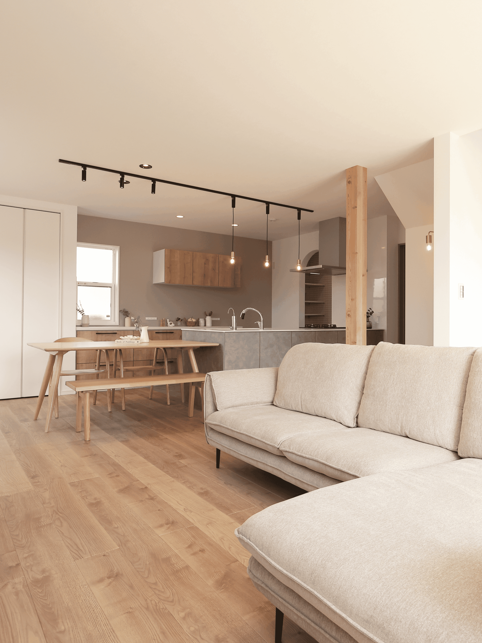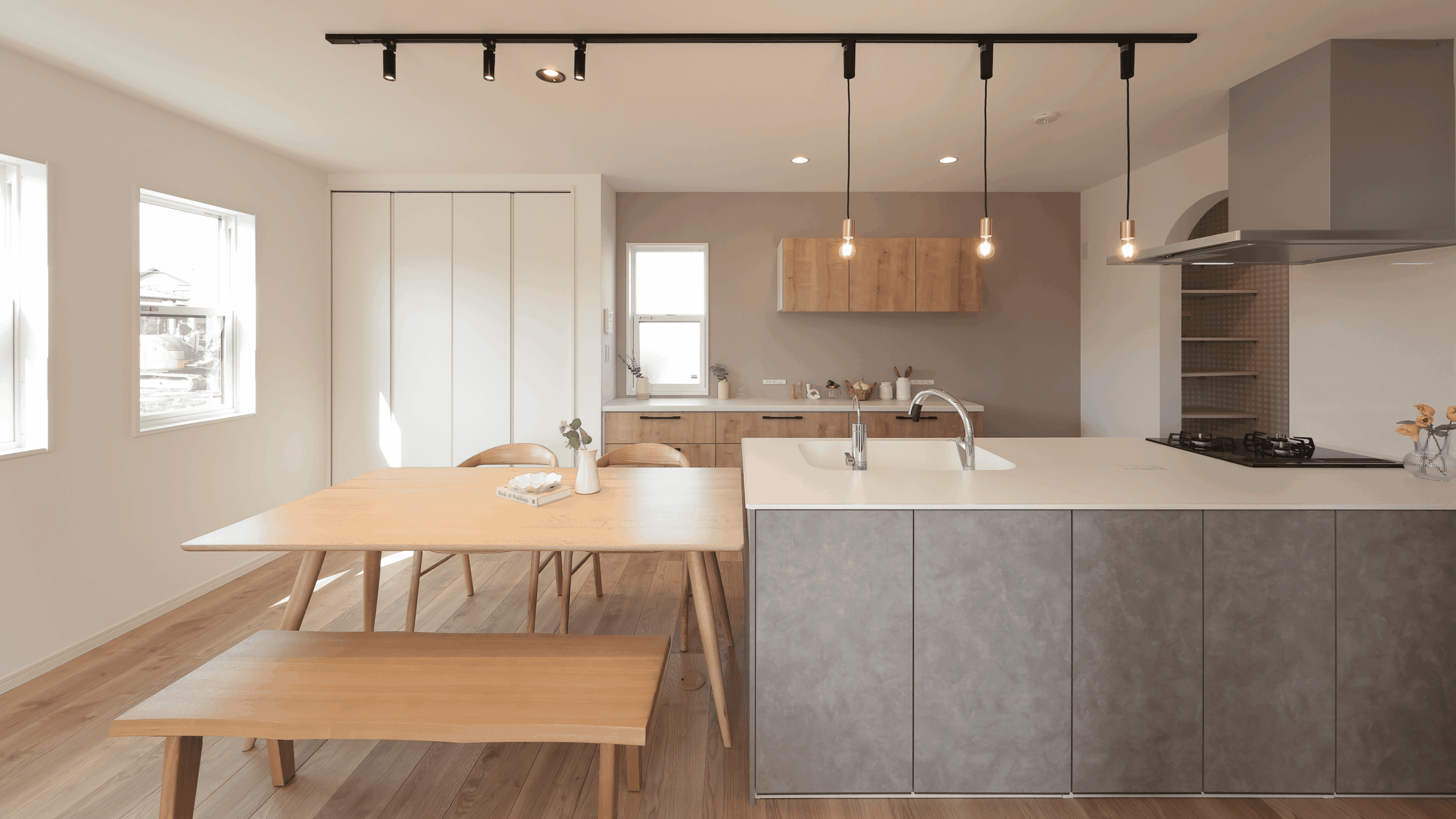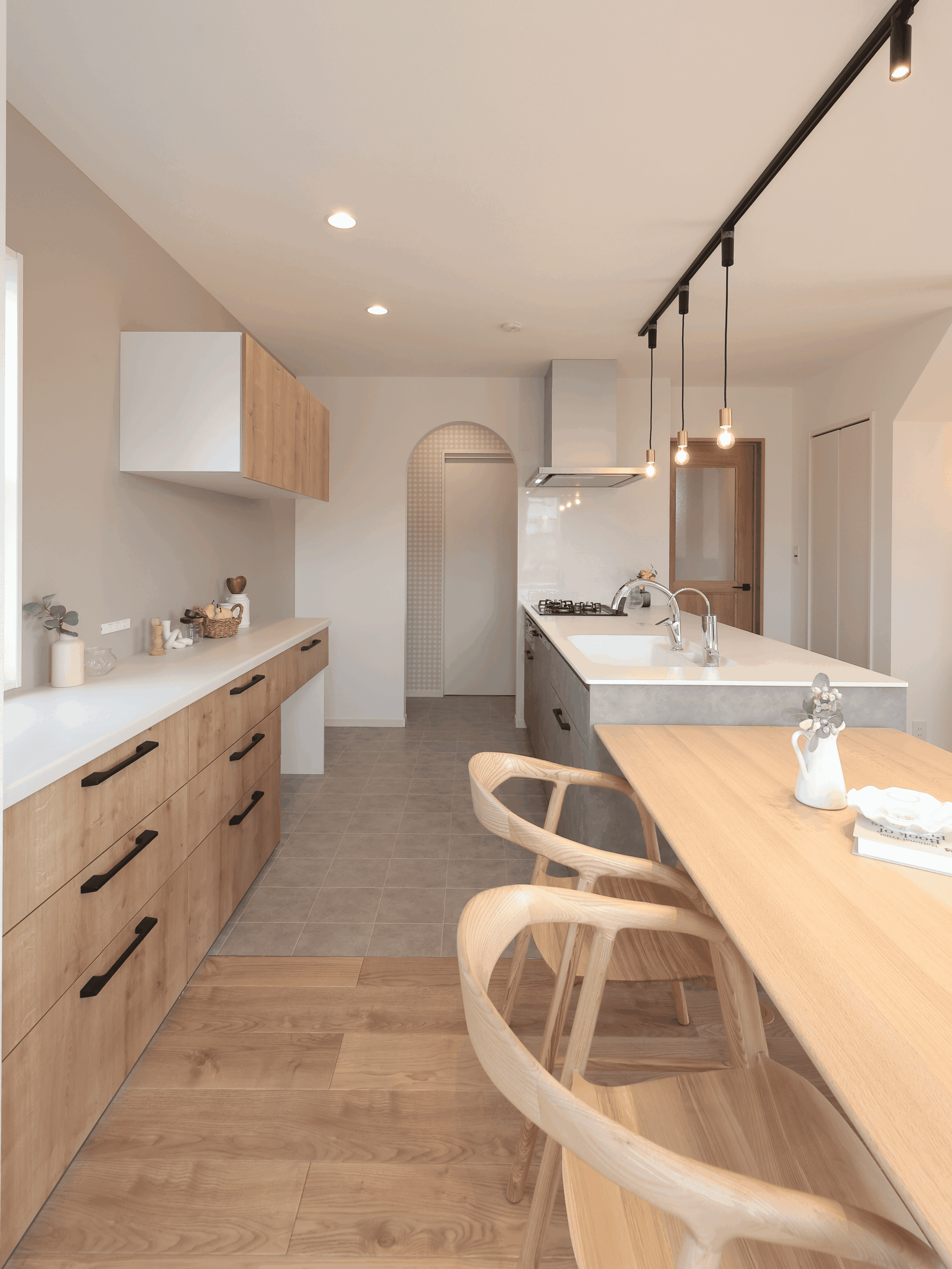 キッチンとダイニングは横並びに。明るいグレー色とナチュラルな家具が良くマッチします。