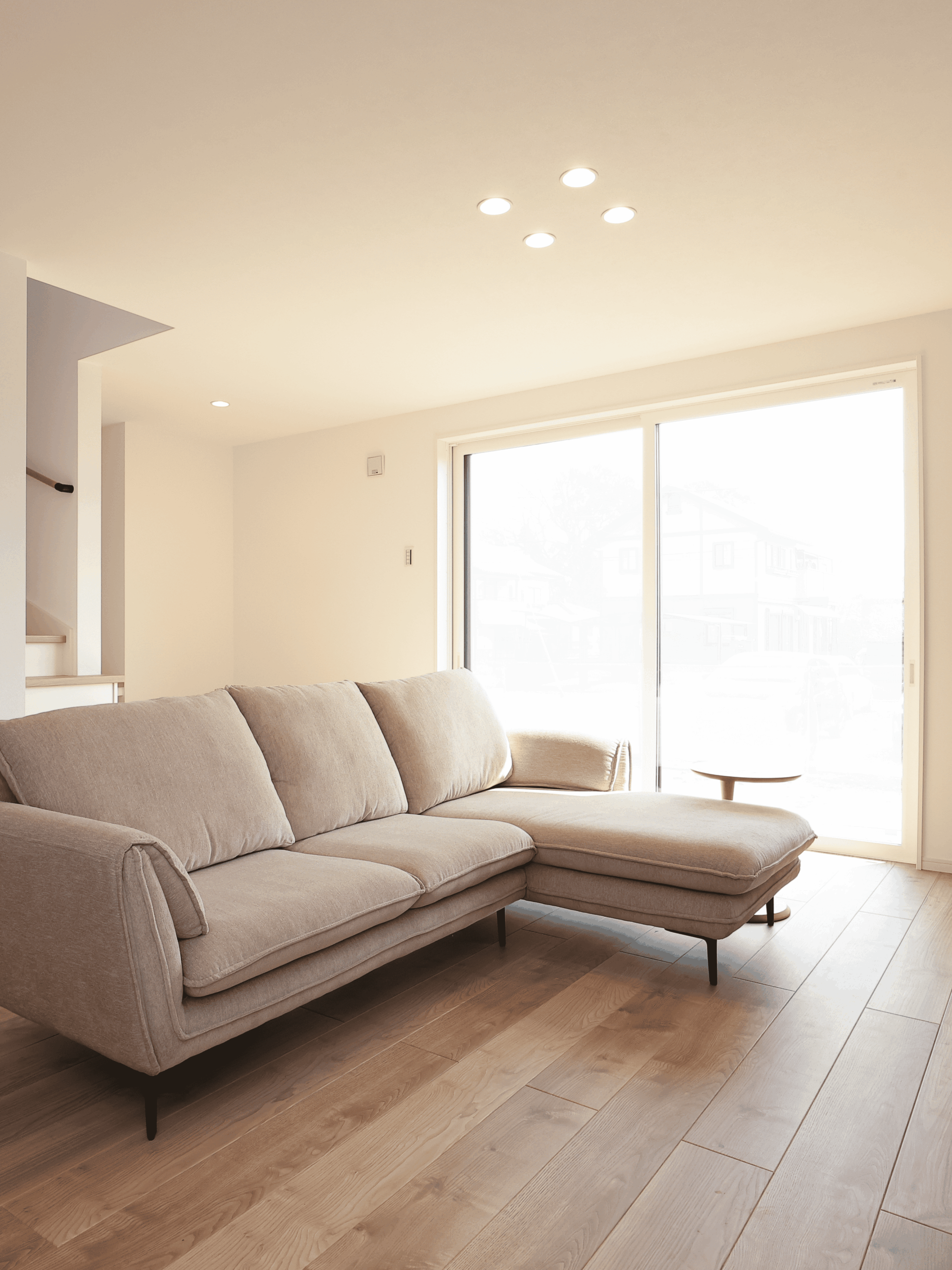 幅2560mm×高さ2400mmの窓はリビングを明るく照らし、広く感じさせます。冬の熱源としても大活躍。