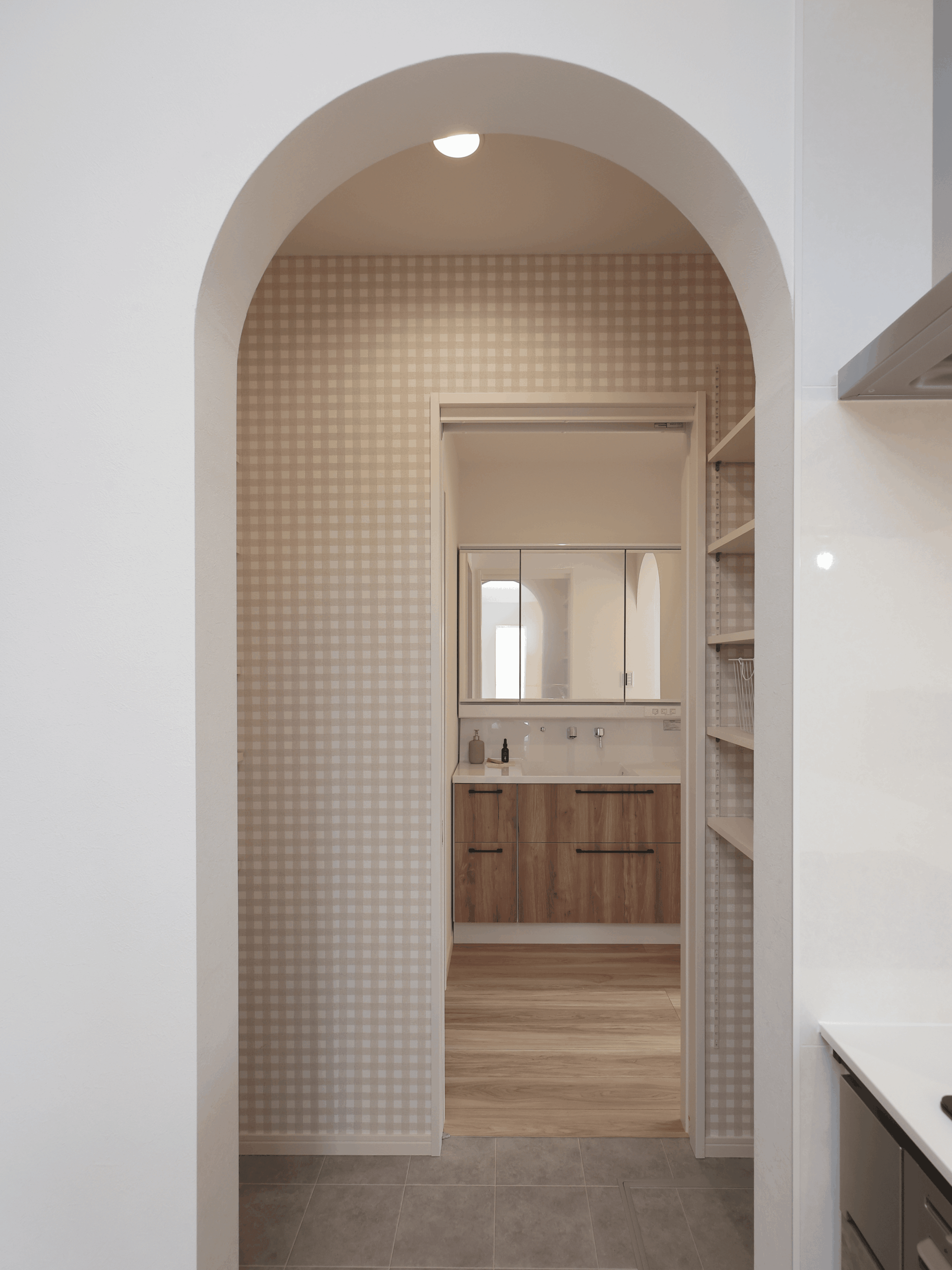 ひと手間加えたアーチのパントリー。その奥にはキッチンからすぐ使える洗面コーナーもあります。この動線はマネしたい間取りのひとつです。