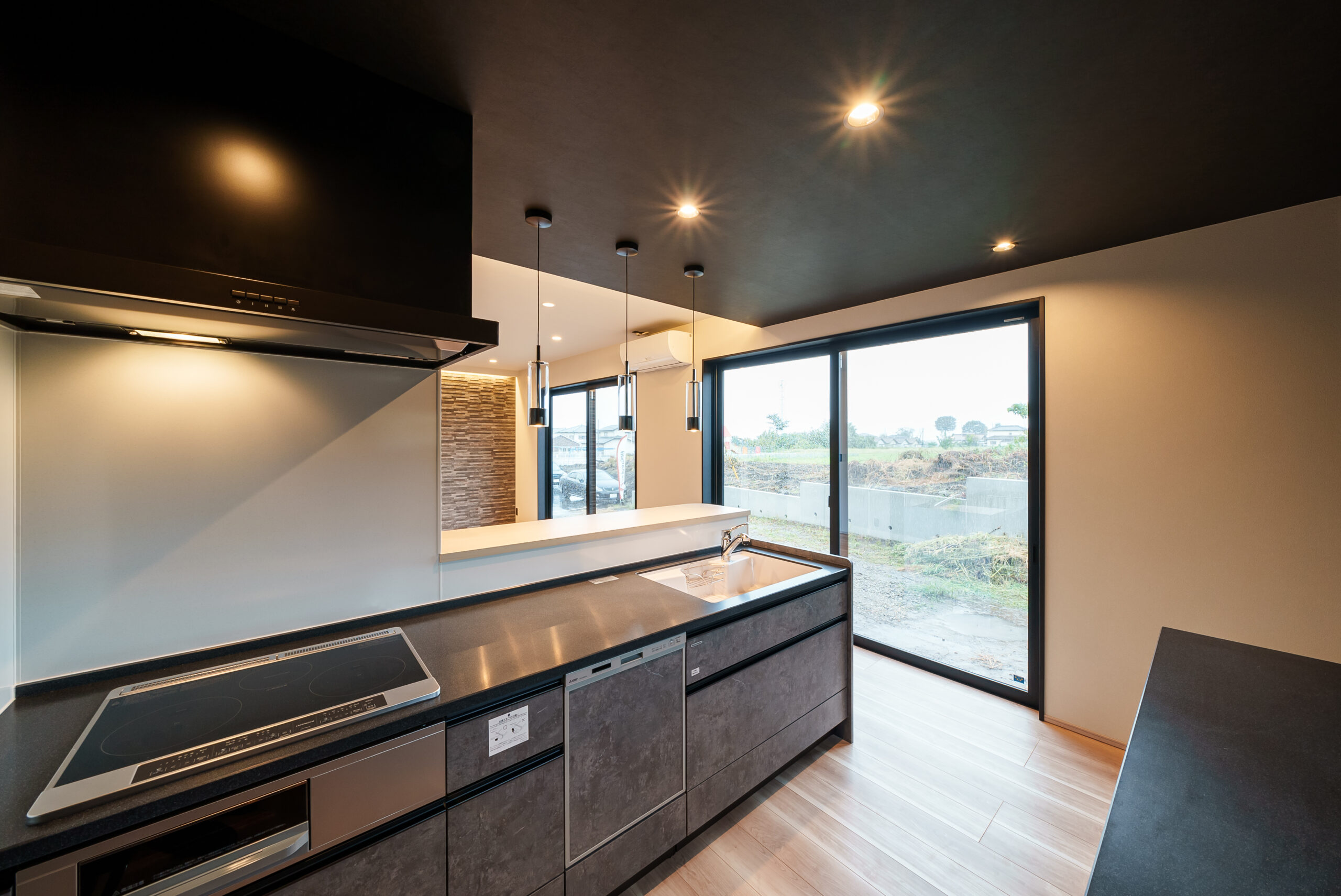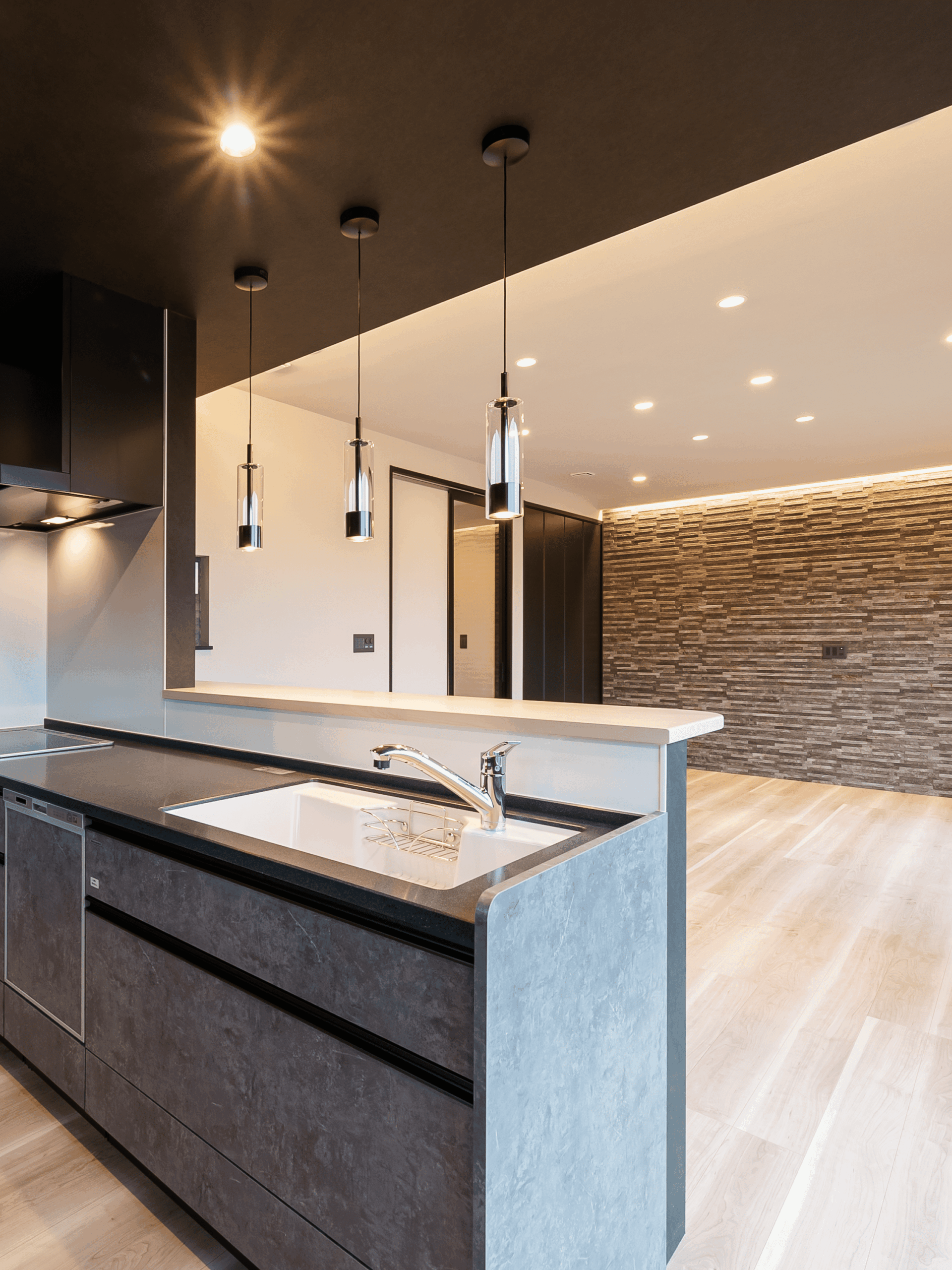照らしすぎない間接照明がシックなキッチンをかっこよく際立たせます。手元が見えないのでお客様が来られても安心です。
