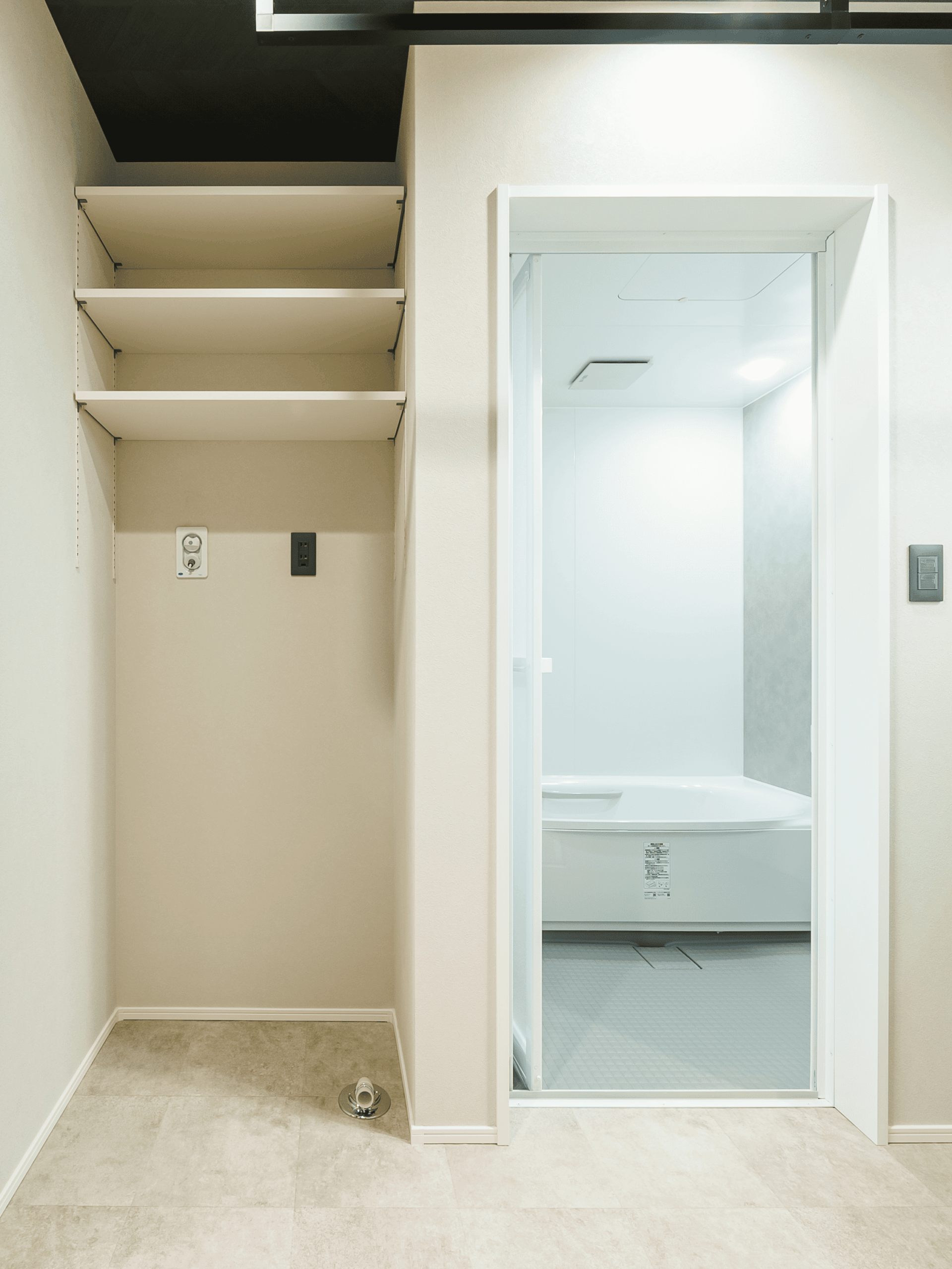 脱衣室兼ランドリーには中干しのパイプとカウンター、収納棚を取り付け家事がラクに済むよう設計しています。キッチンの横になるので奥様想いの導線です。