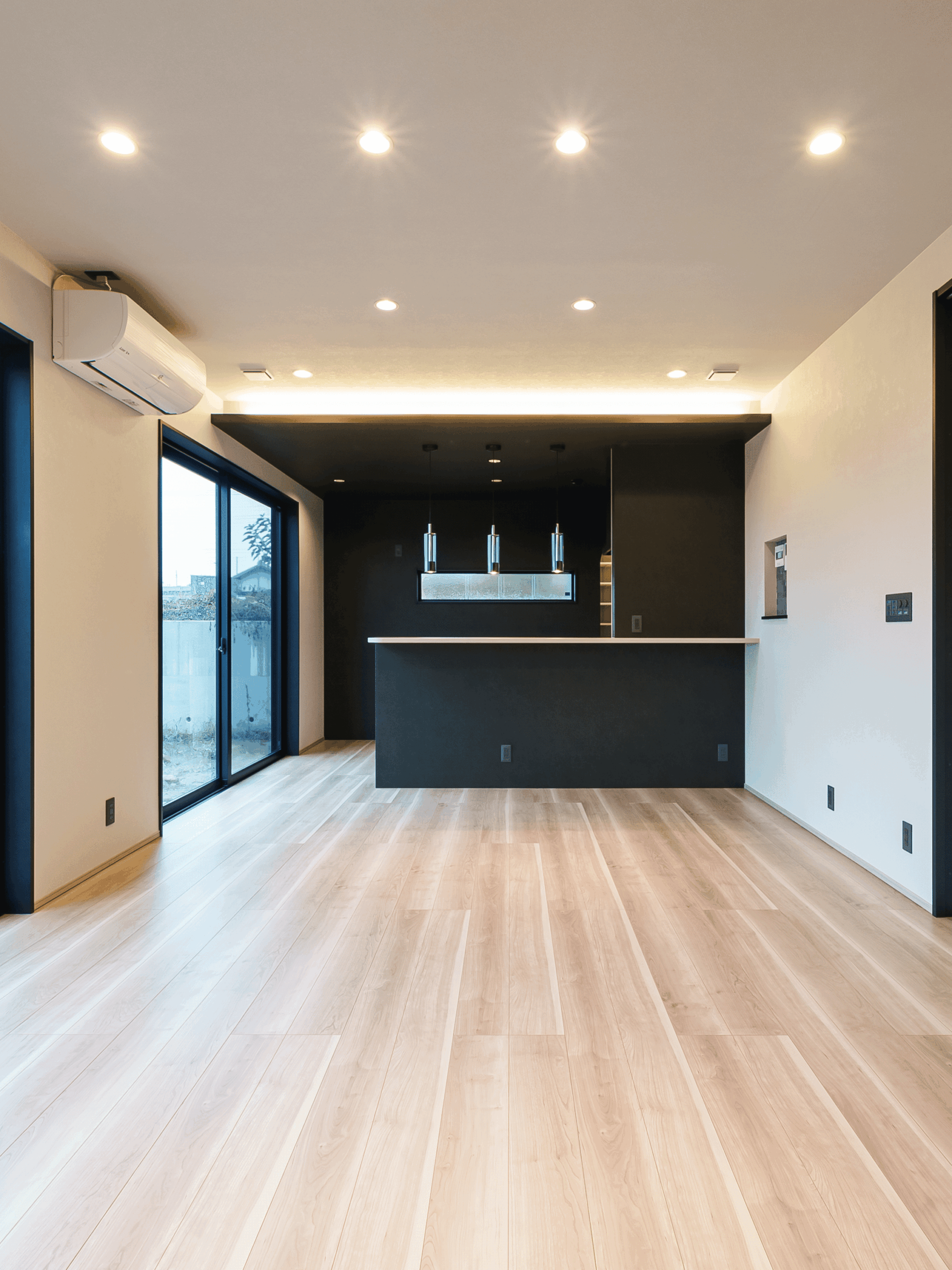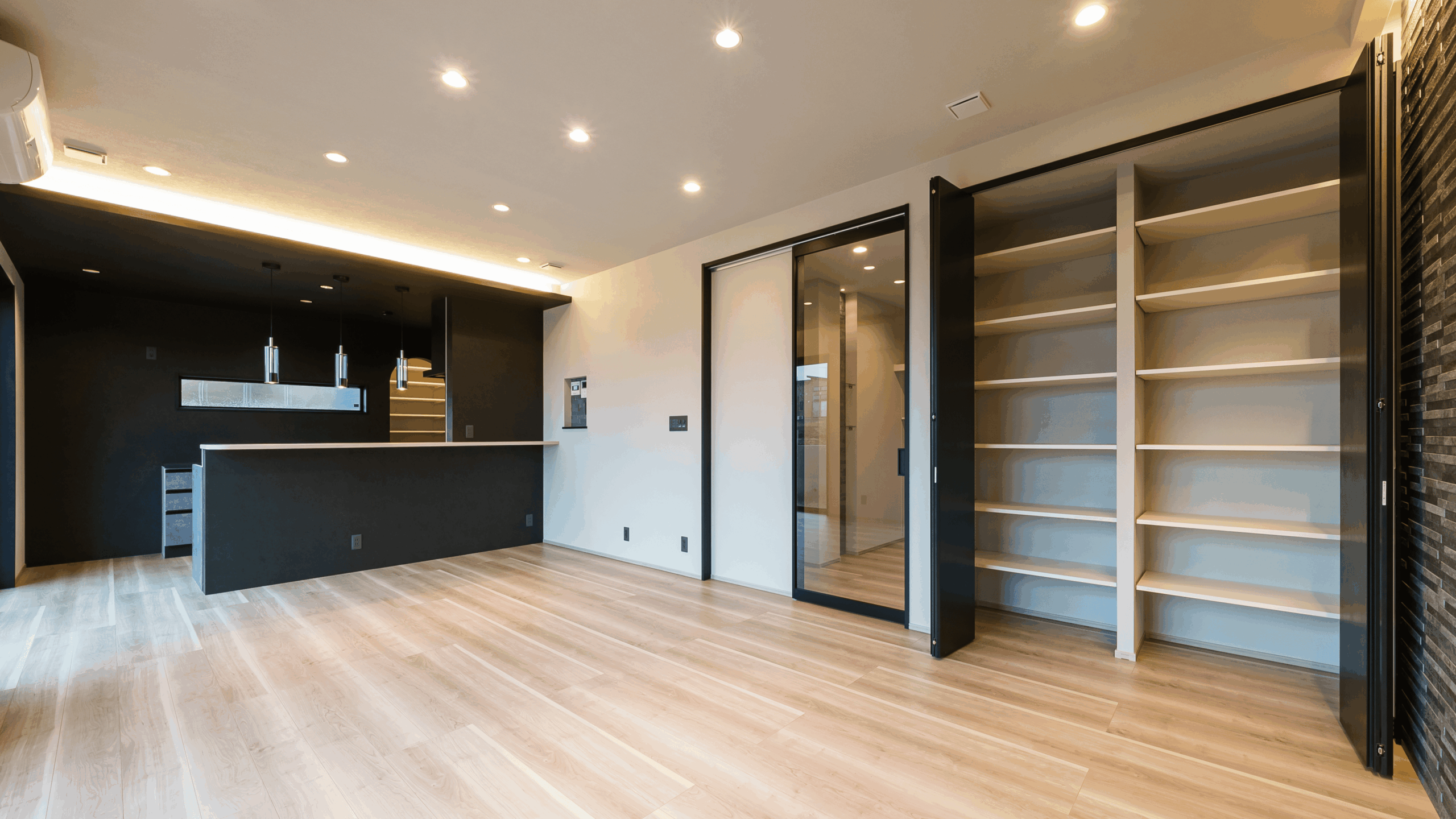 LDKと廊下を繋げる扉は高級感あるガラス戸です。TVボード面はエコカラットを採用して間接照明が美しく照らします。