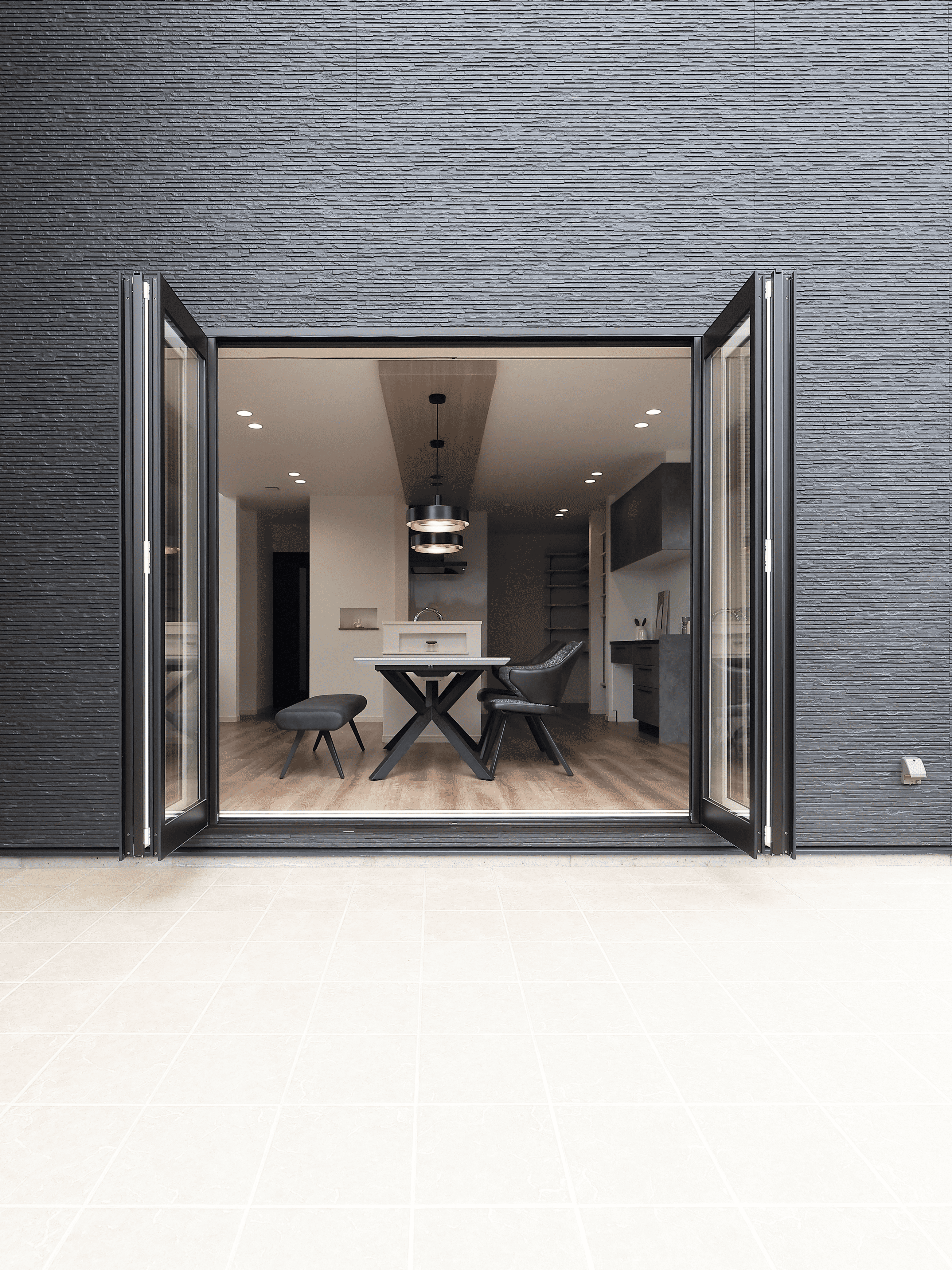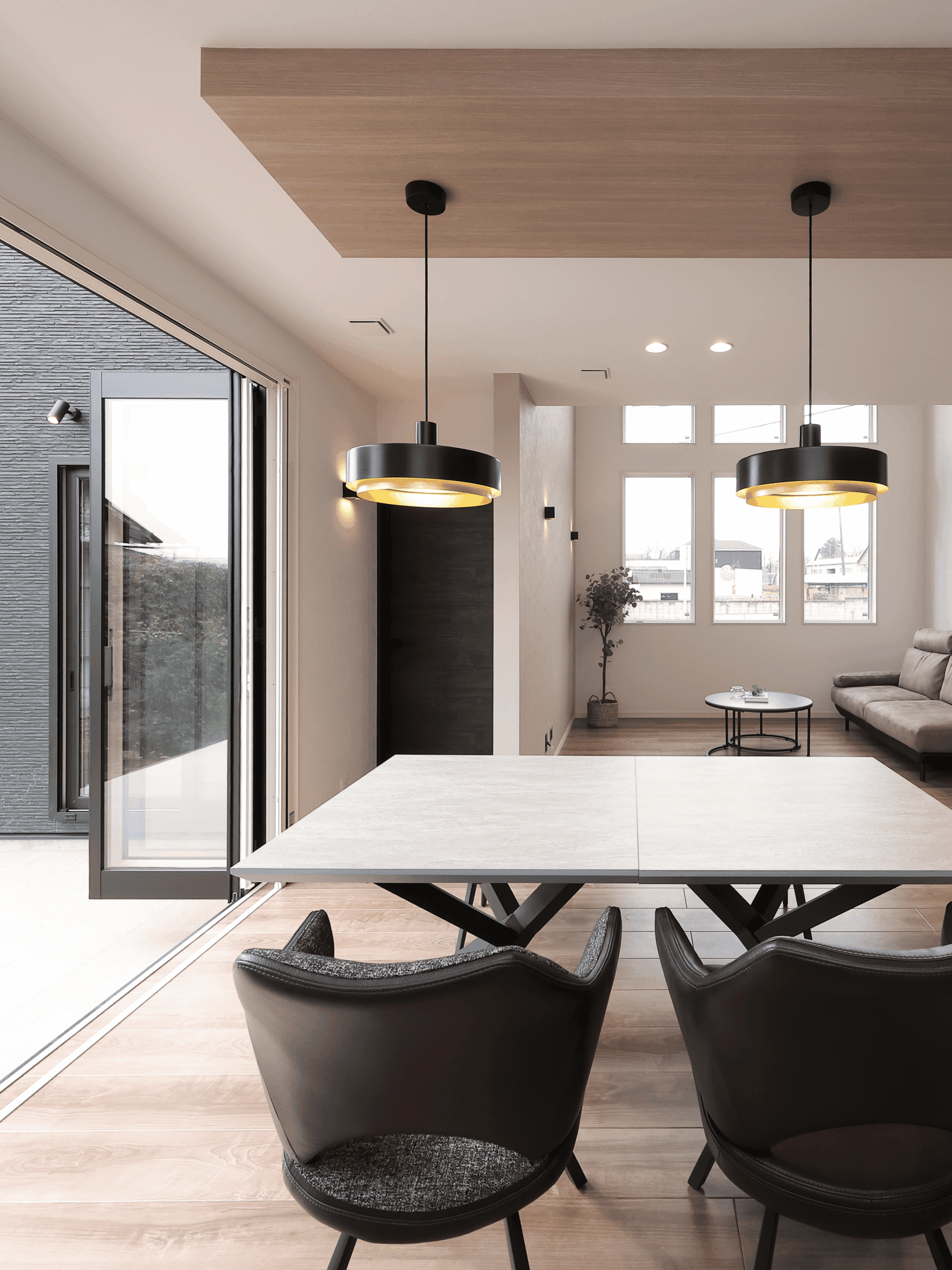 普通の掃き出し窓ではない、ワイドオープン型の窓はより開放的に使い道を広げます。外のデッキは2つ目のリビングとして家族や仲間の集まる場に。