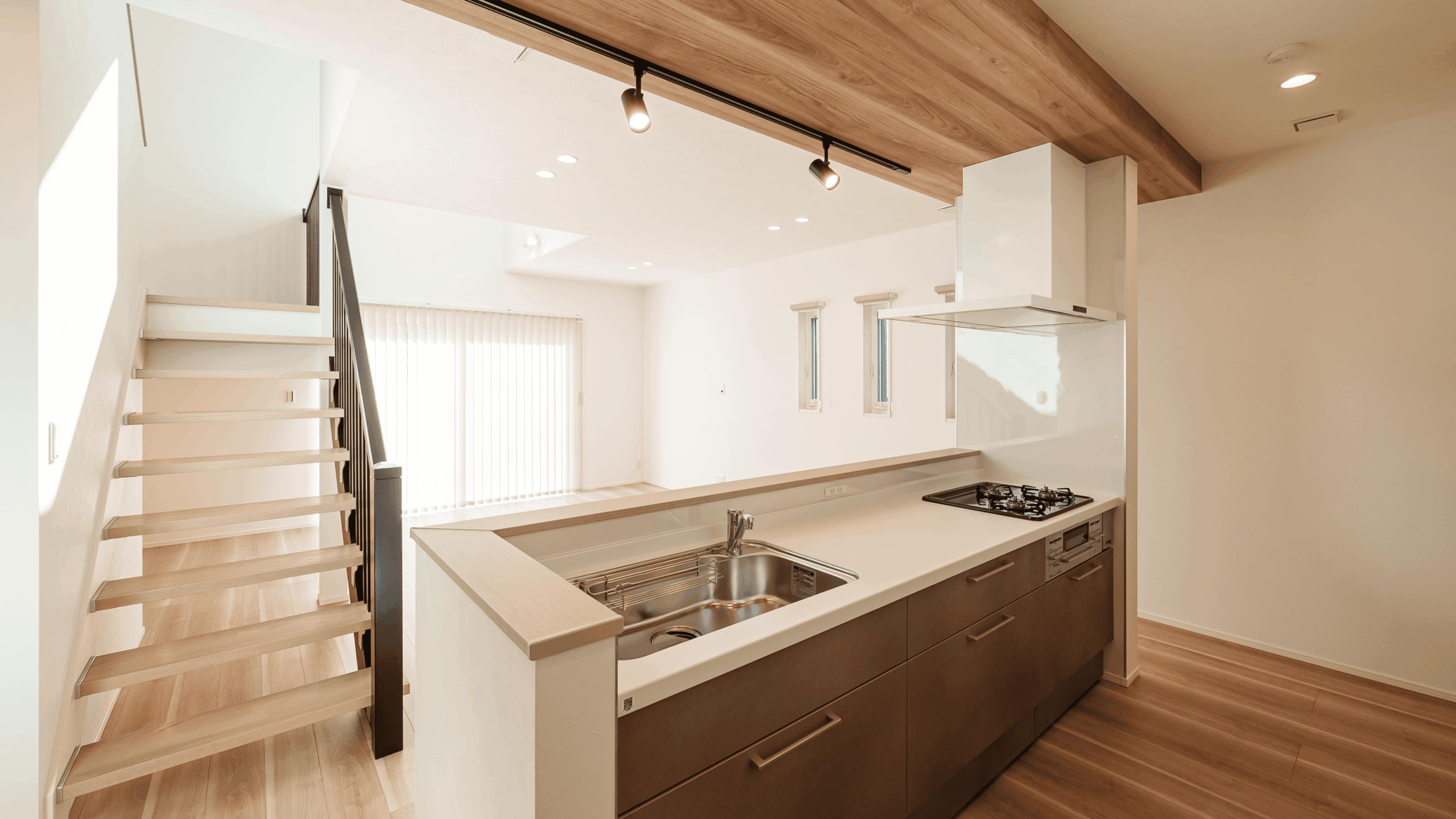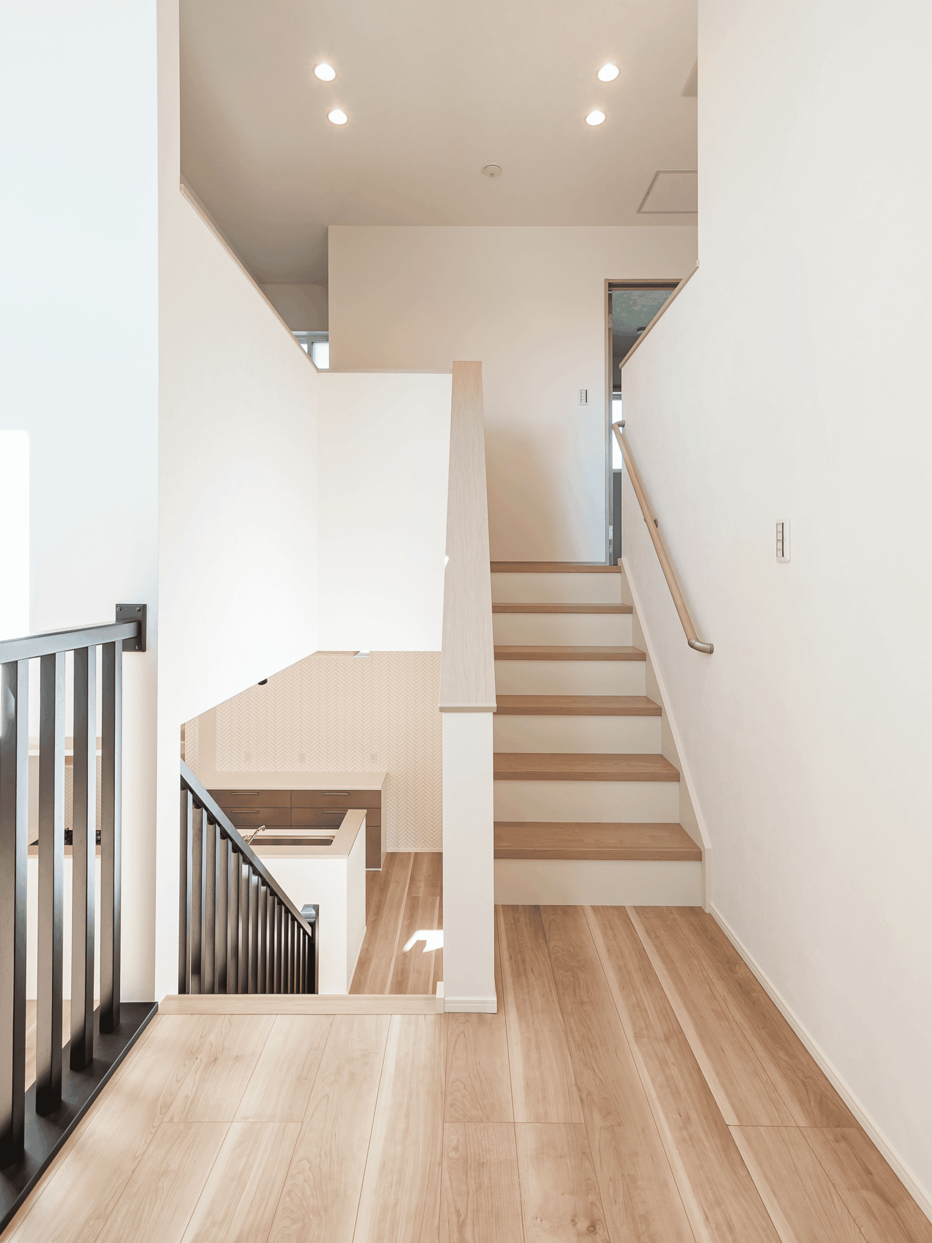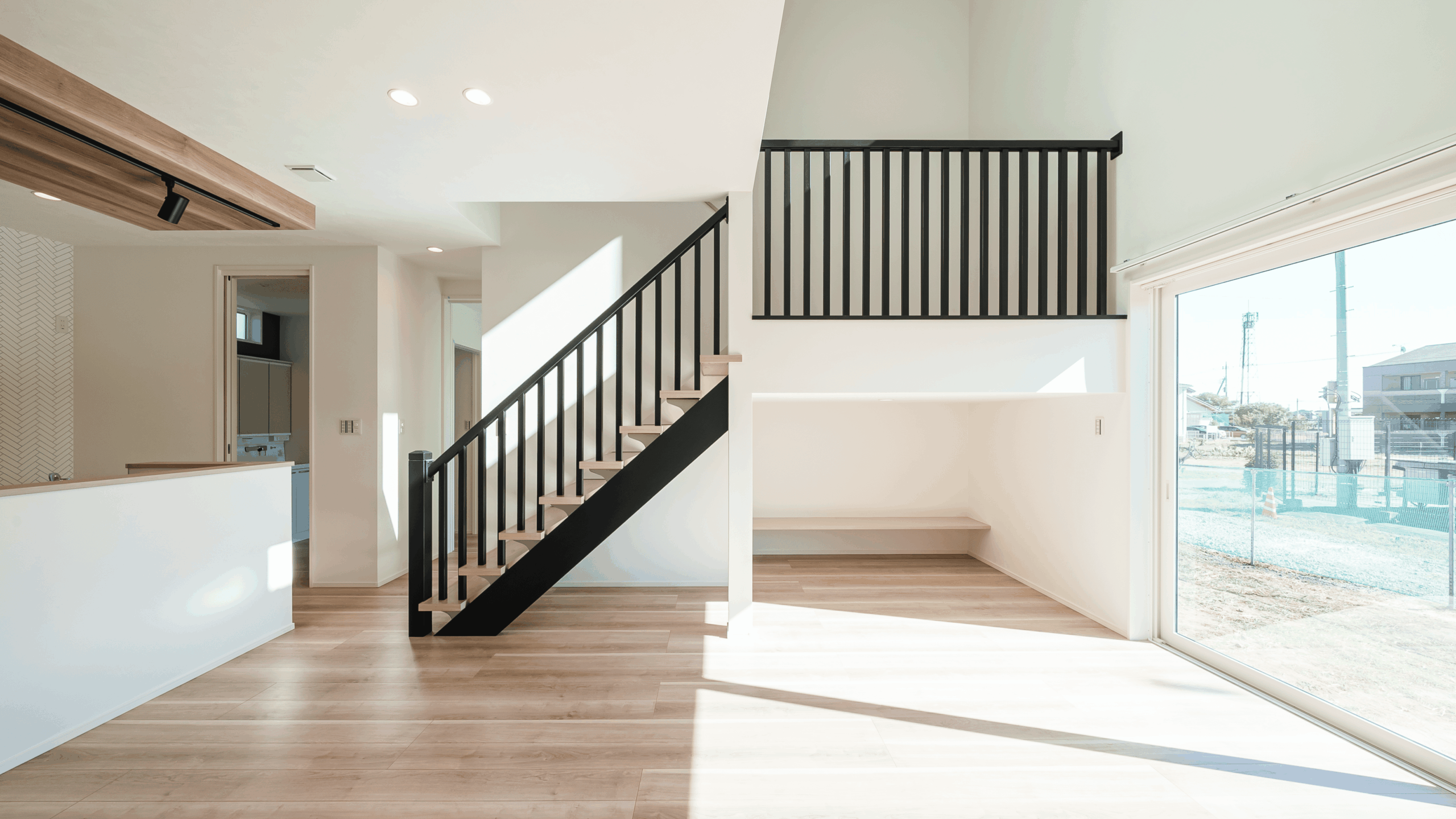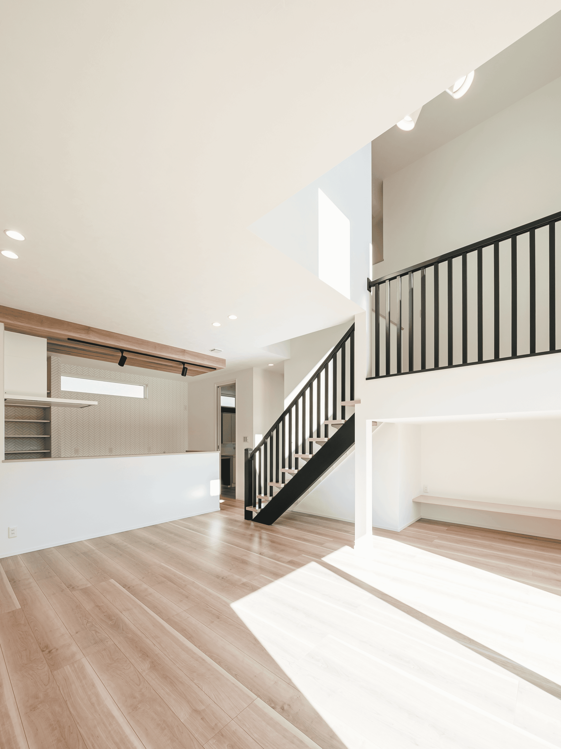 アイアンの手すりがカッコイイです。吹き抜けの窓から優しい光が照らします