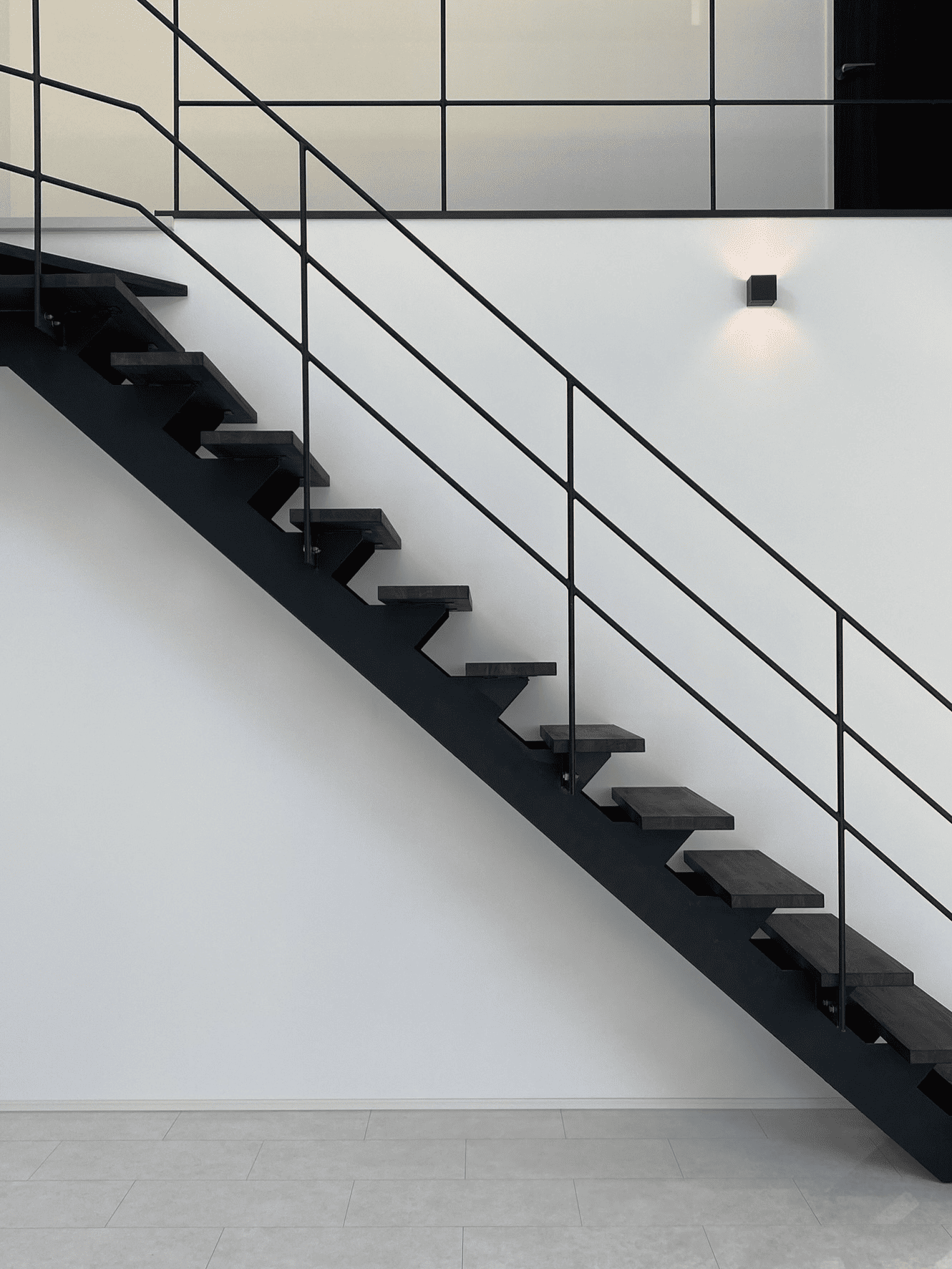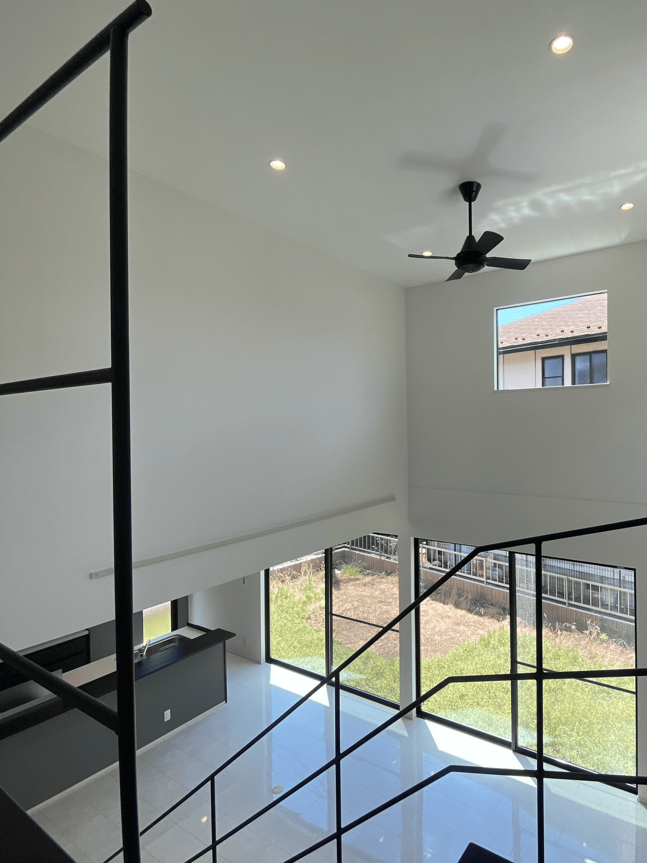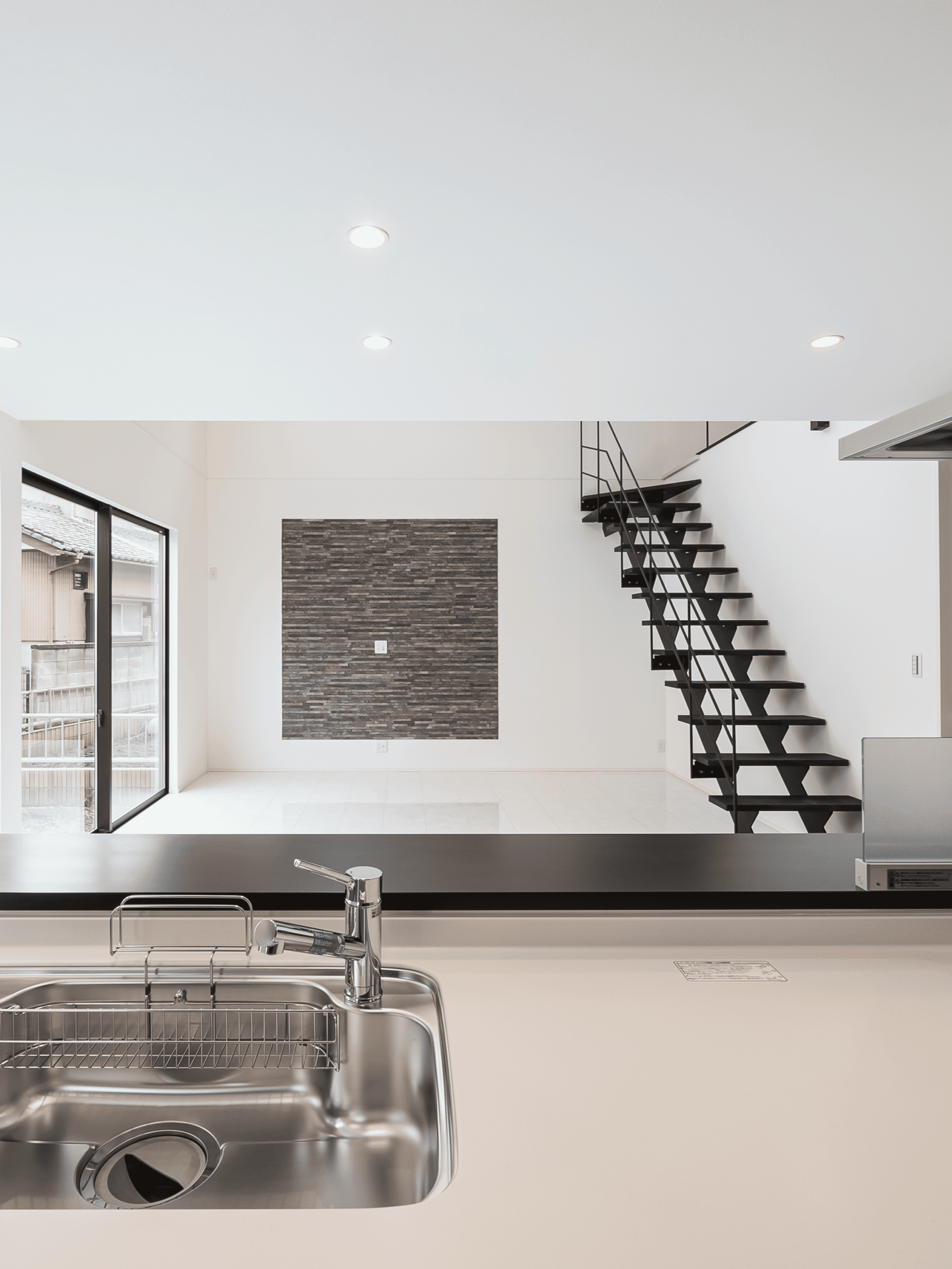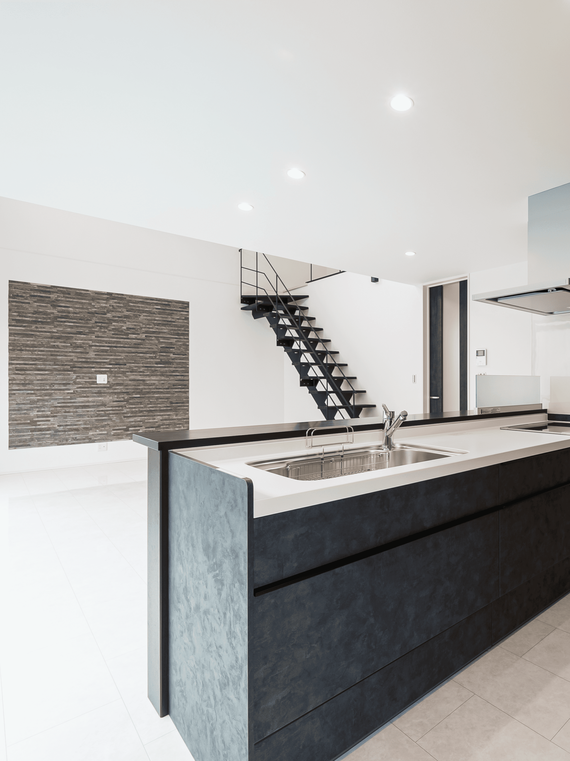 無骨なアイアンの鉄骨階段は一目見て惚れ惚れしてしまいます。白の輝きのある床がよりアイアンの黒を際立たせます