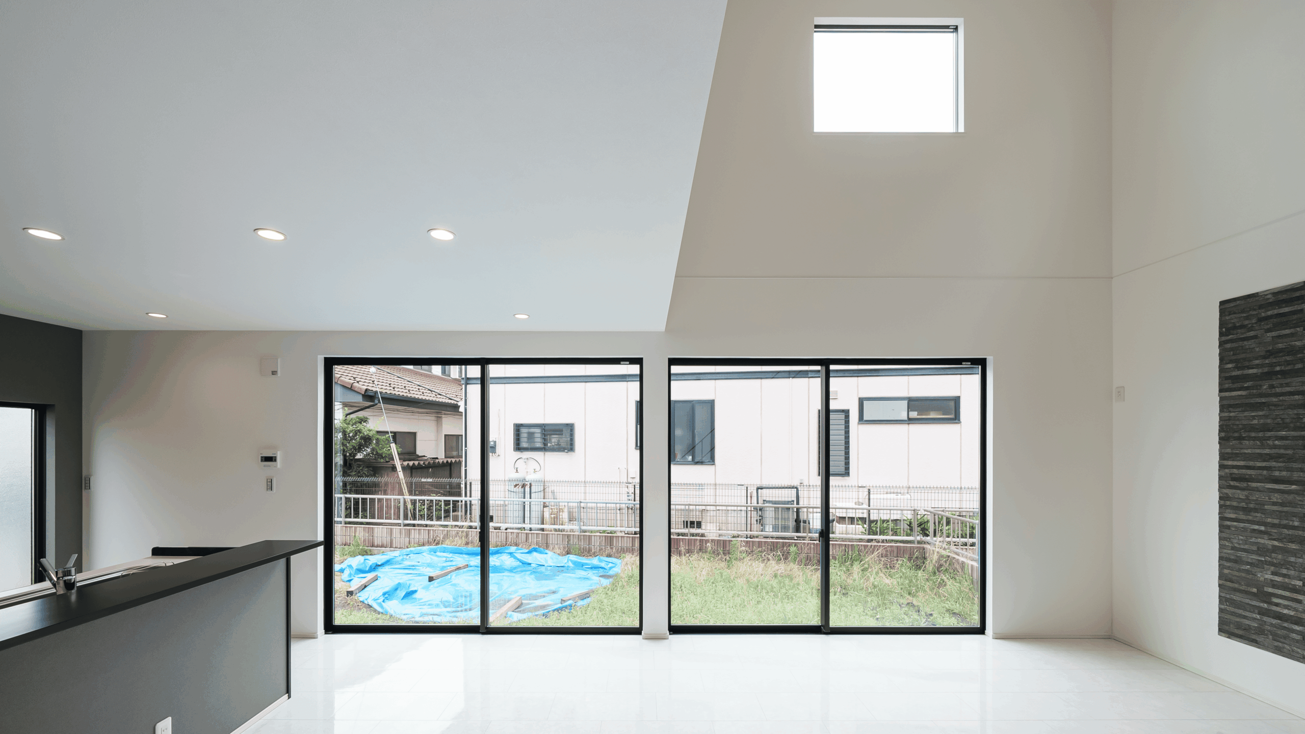 2.56m×2.2mの掃き出し窓が2つとハイサイドライトがLDKを明るく照らします。外と空間がつながるような窓の配置に