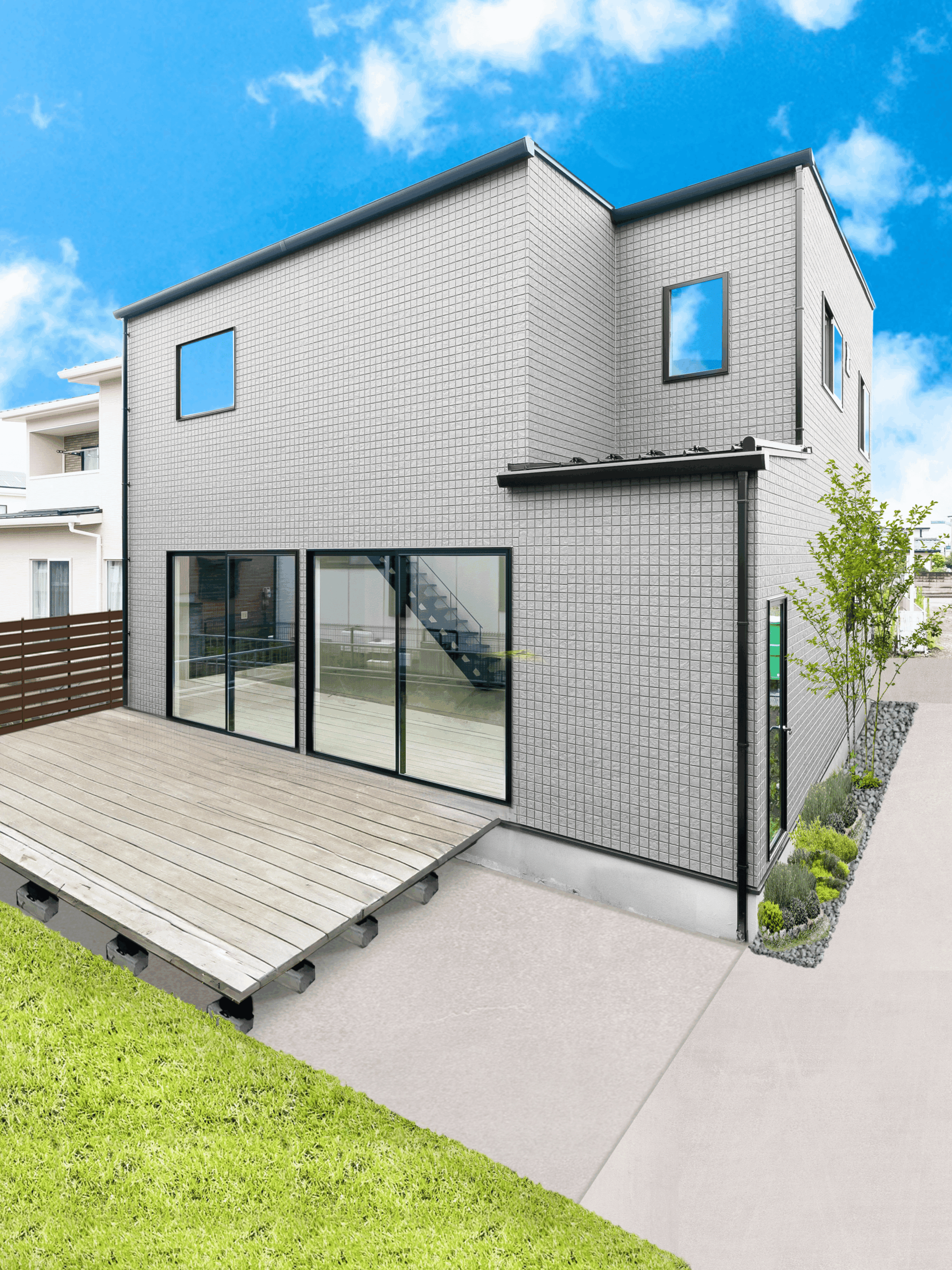 キュービック型で飽きのこない外観で外壁も石調の個性的ですが、流行に左右されないメインの外壁と玄関周りにはウッド調のアクセントをつけた外壁を貼り分けています