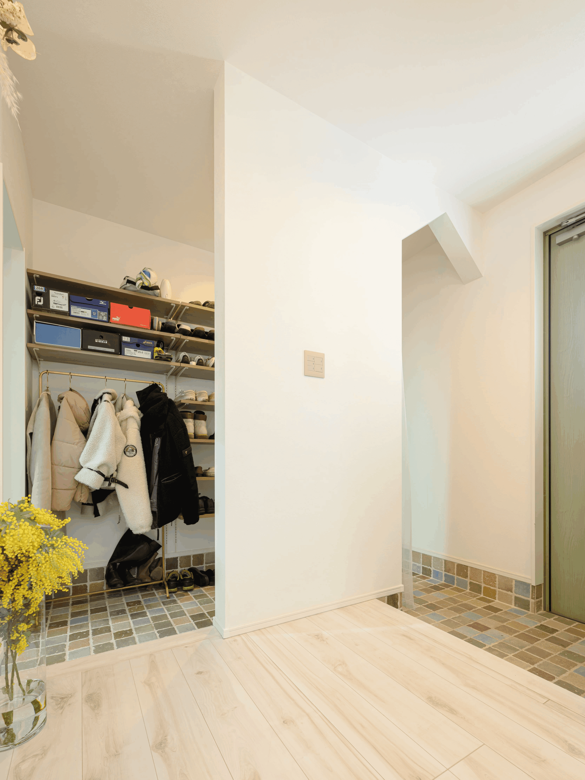 コート掛けも設置したシューズクロークは靴を置けるだけでなく、ベビーカーや折り畳みの自転車くらいは余裕で収納できます。