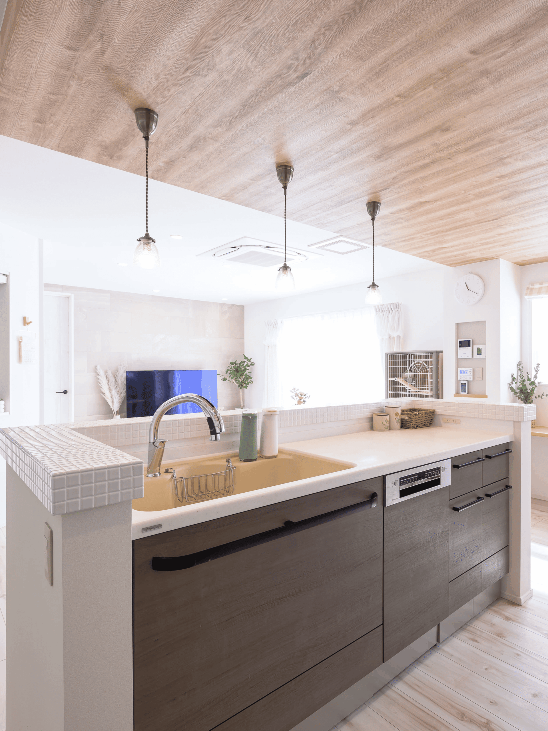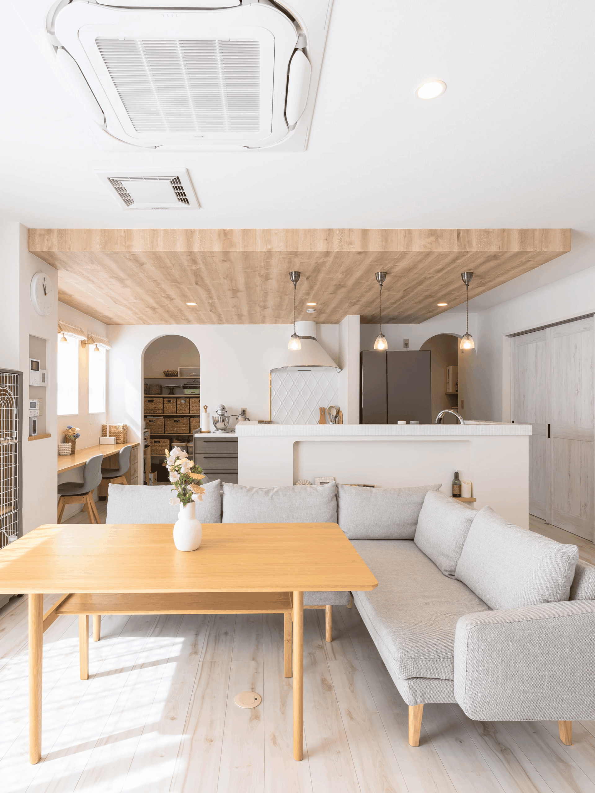 陽の光がたっぷり入る明るいLDK。キッチンの天井は下がり天井を採用して可愛らしい雰囲気を演出します。
