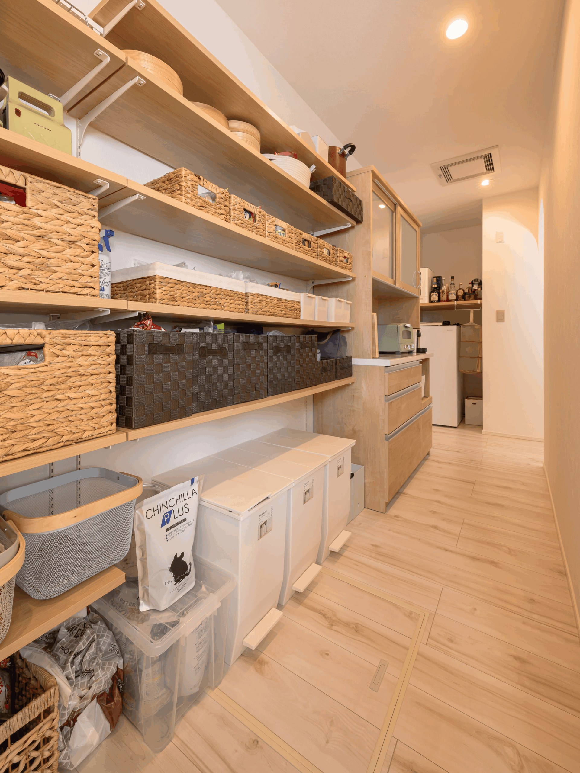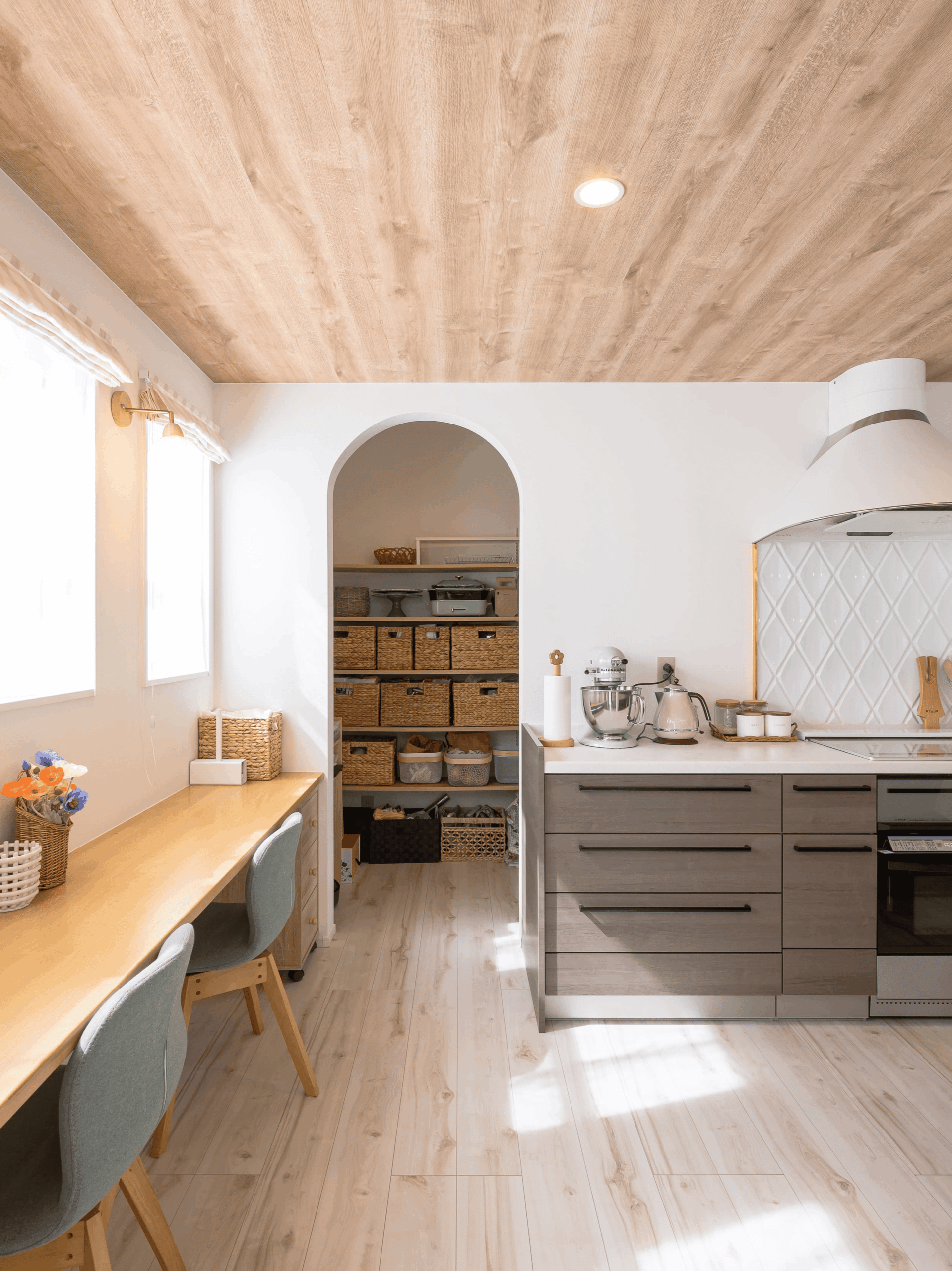 アーチをくぐるとたっぷりのパントリーがあります。ゴミスペースも裏に持ってくることで非常にスッキリとしたキッチンになります。