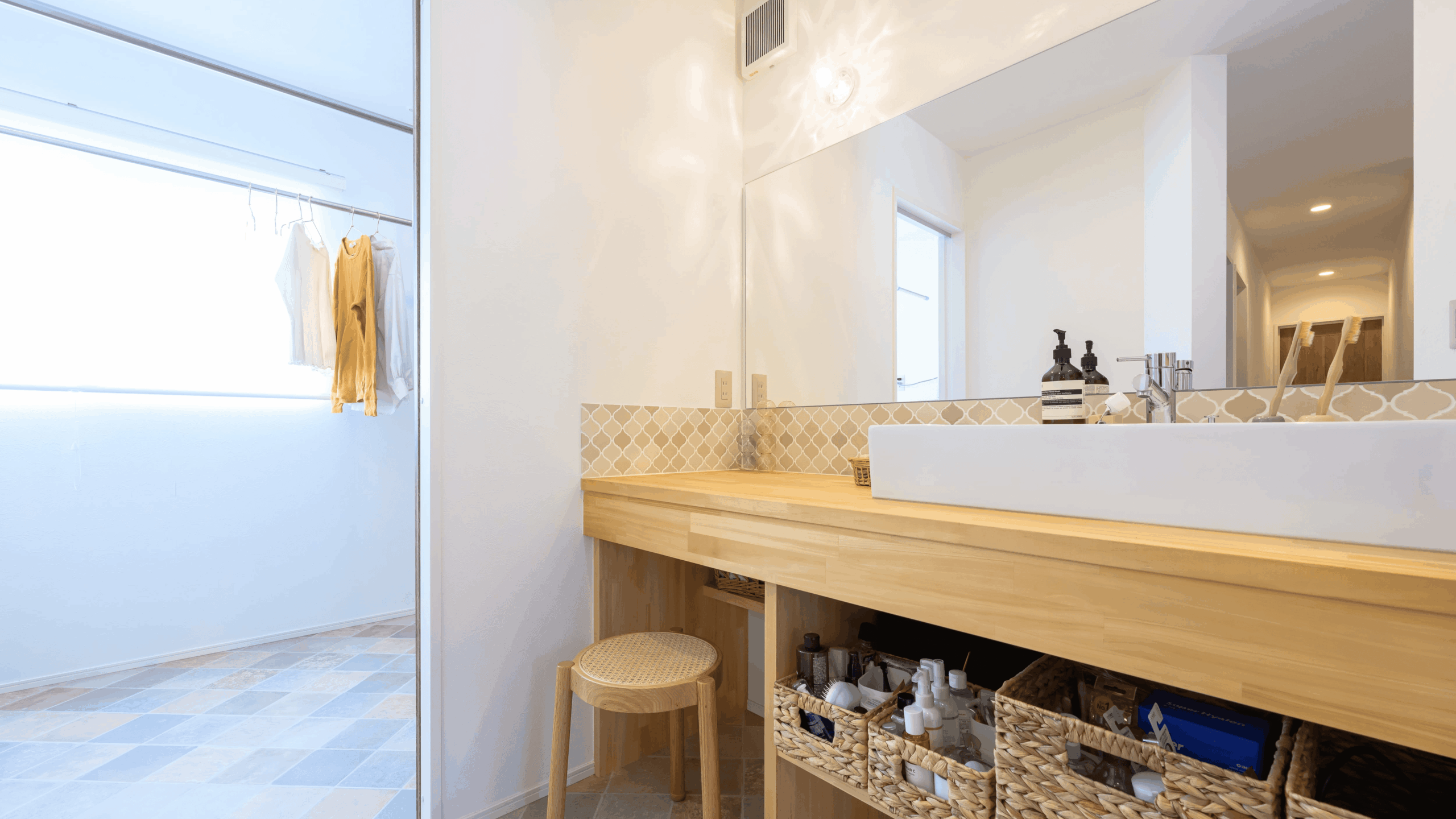大人2人並んでも大丈夫な広い洗面台と隣にはランドリーを作り、動線にもこだわっています。