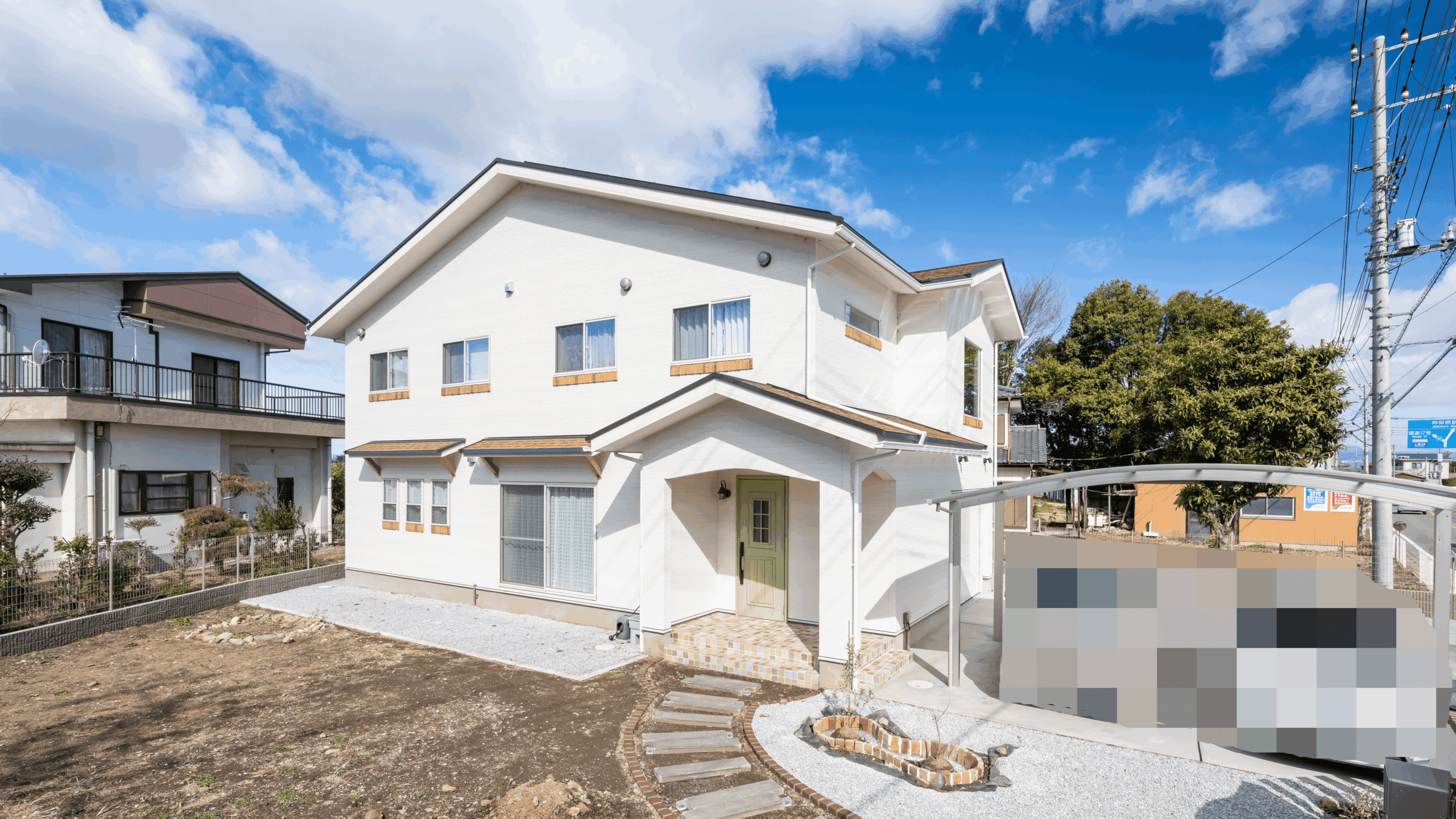 住宅地の一画に「おっ!」と目を惹く真っ白のキレイな外観にモスグリーンの玄関。まるでこのお家だけ南欧の柔らかい日差しと爽やかな風が吹いているかのようです。窓周りにレンガ調のカバートリムを施工することで真っ白の外壁にちょうどいいアクセントをつけています。