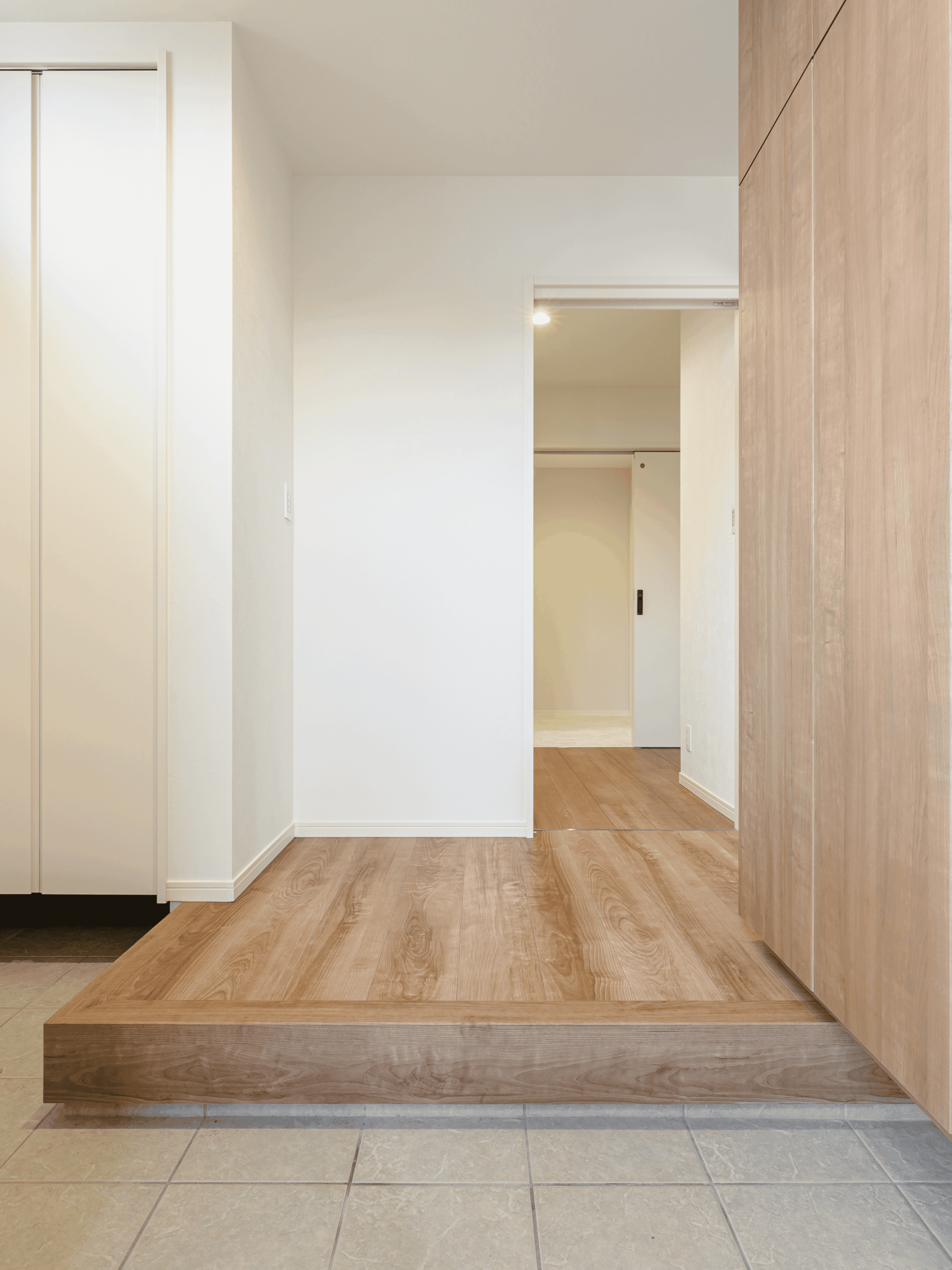 高さもあるシューズボックスと外で使うものを収納できるスペースのあるエントランス。