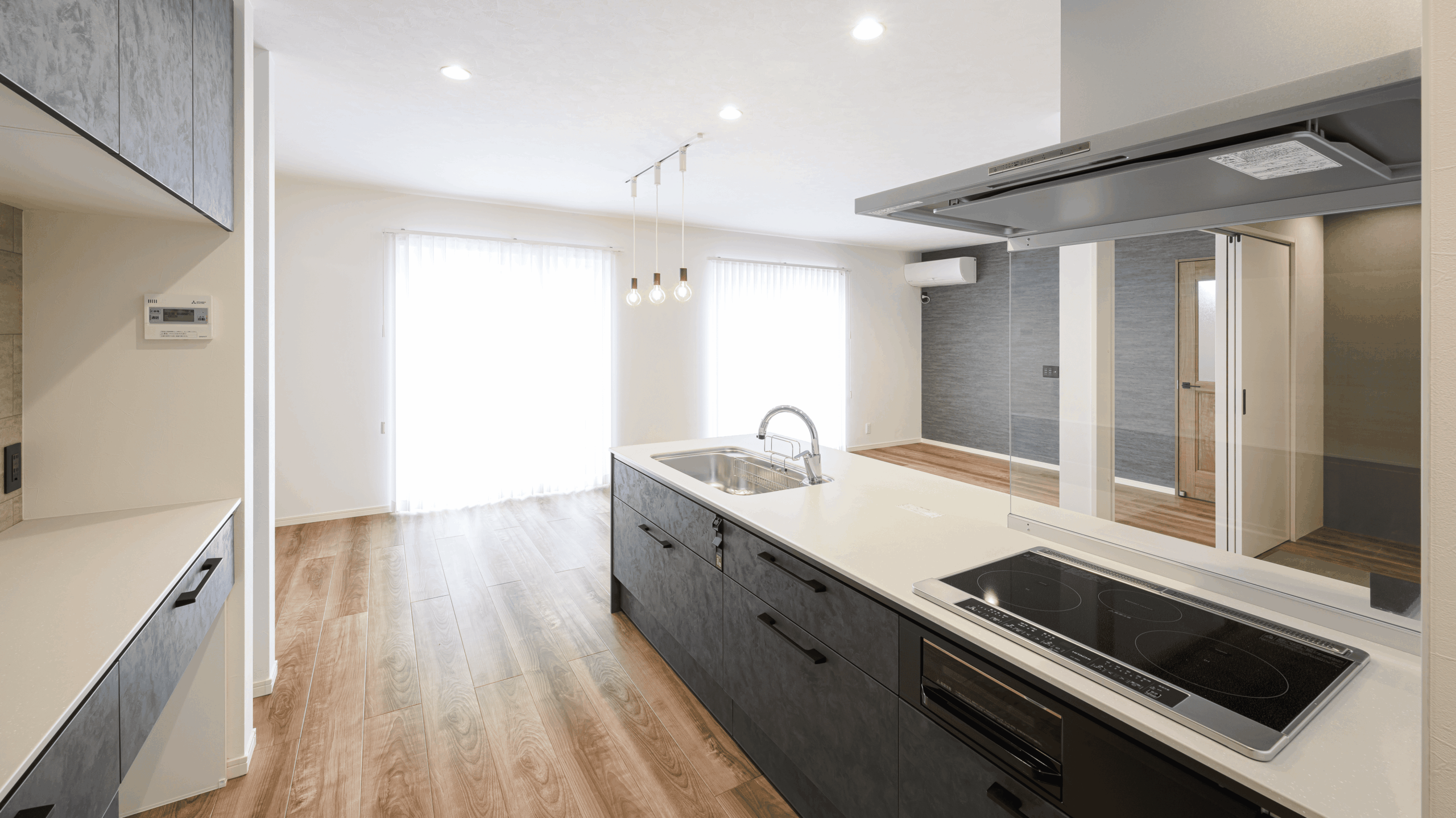 グレー色の外壁は汚れも目立ちづらい人気の色です。太陽光も搭載しており、将来の電気代のことまで考えられています。
